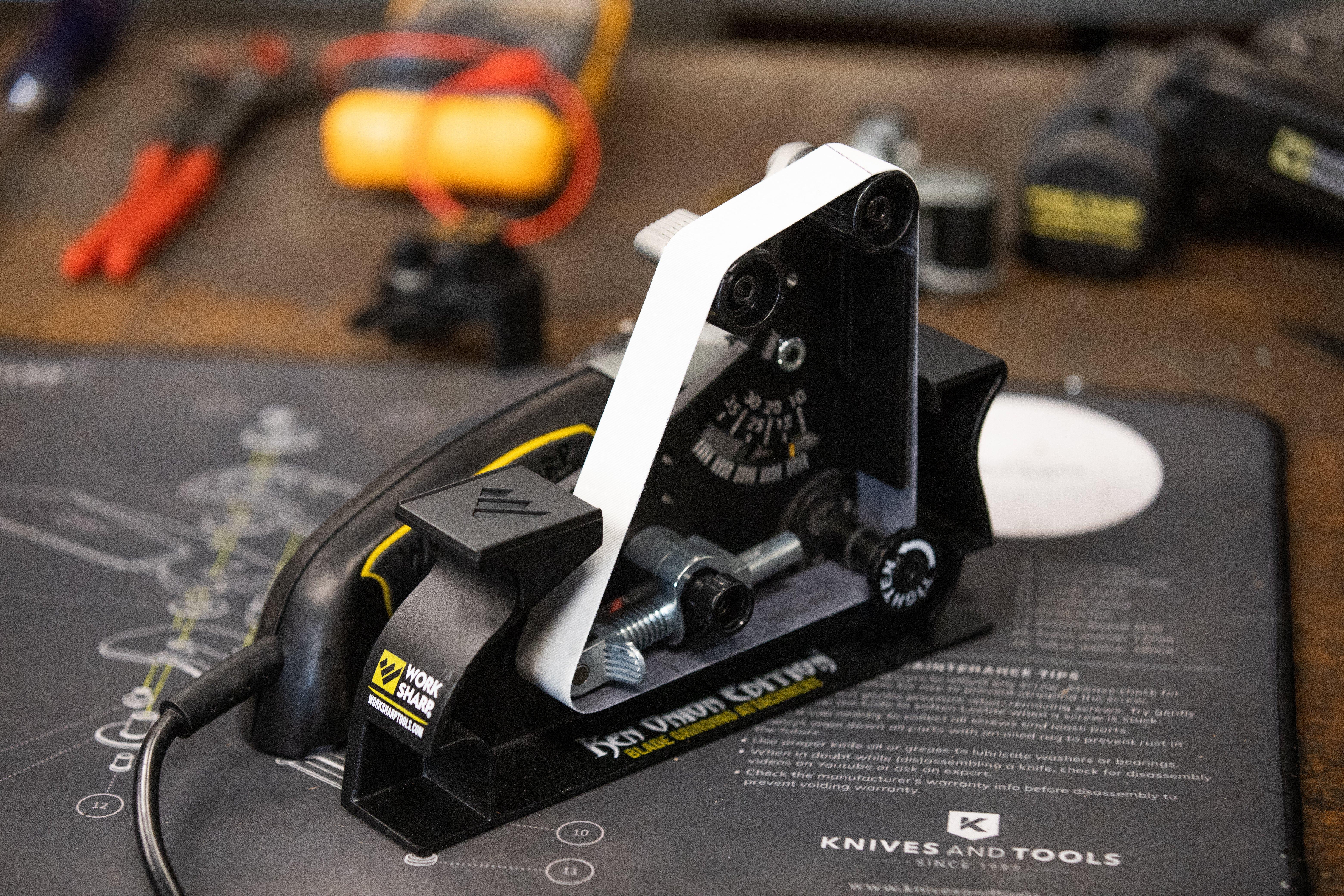 Quality abrasives and attentive technique, regardless of the sharpening system, will produce quality results. Likewise, improper technique with quality abrasives will produce poor performance. For the last six months, I’ve continually tested, modified, and improved skills with a 1”x 30” belt-driven sharpening system with a fixed angle guide. Larger format sandpaper spinners are common knowledge in the knife industry, enthusiast community, and many general knife-users may notice a grind pattern from a factory blade and presume it had to be machined into “like a wedge slicey shape” somehow. A common misconception assumes that edges finished at the factory, or any edge finished on motor-driven belts could be cooked, referring to heat ruining the temper of the blade. Likewise, skeptics may claim belts cannot reach the refinement necessary for “true sharpness”. It’s good to be aware that over-heating a hardened steel will weaken the underlying structure and performance. Thankfully, for sharpening, heat is straightforward to avoid with lower speed belts than used during a knife’s construction, a light touch to finalize the apex, and stropping strokes to further refine things.
